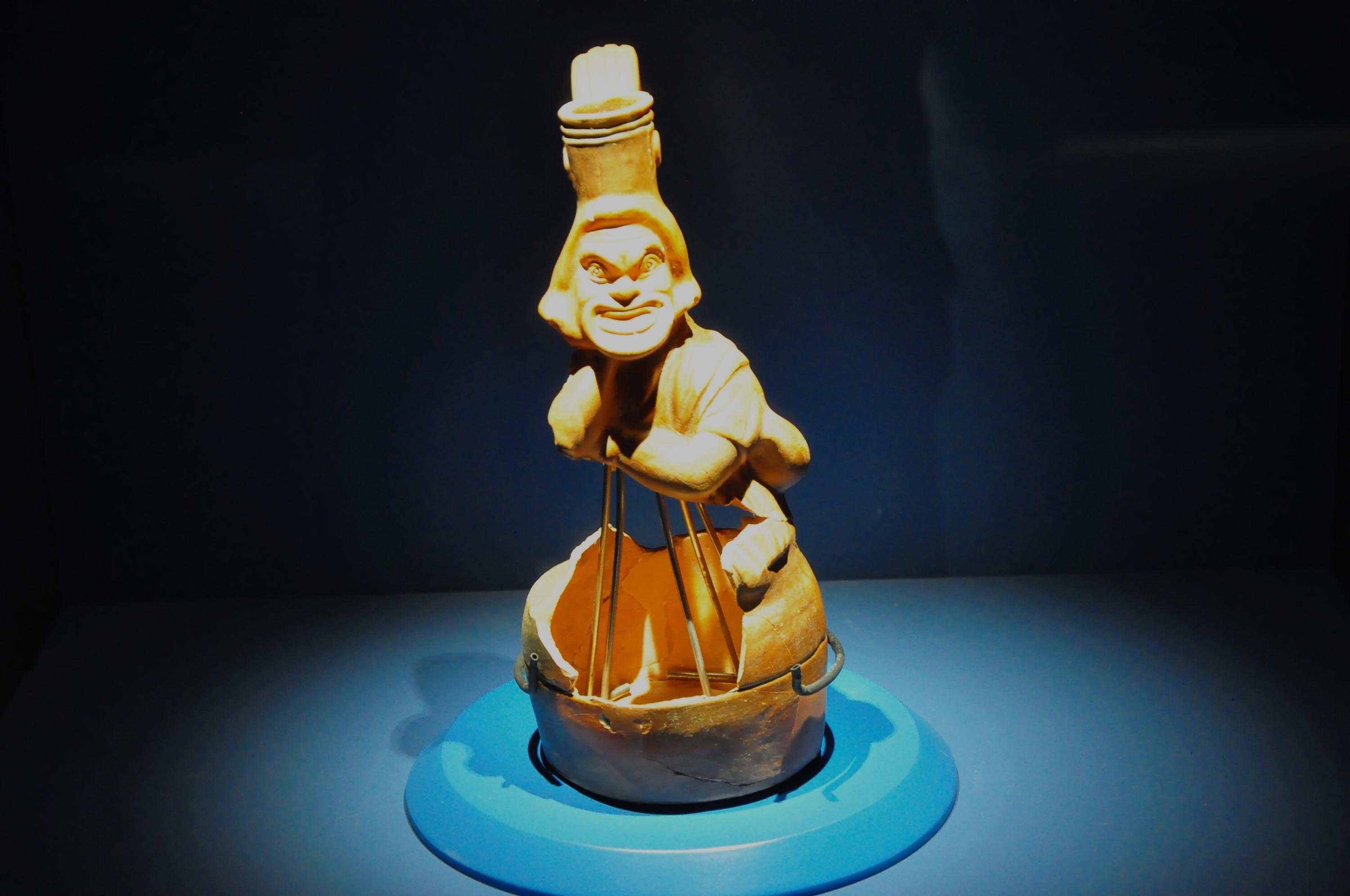 “Bu vazo, antik dönemde sıvı libasyonu yani sıvı dökme ritüelleri için kullanılan özel bir sürahi. Üzerindeki figür, tiyatro oyuncularının oyunlarda kullandığı pişmiş toprak maskelerden birini taşıyan bir komedya oyuncusunu tasvir ediyor.